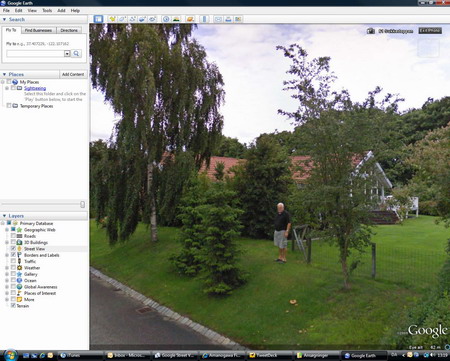 Så nu hvor Street View er kommet til Danmark skulle jeg lige fordi kendte adresser og se hvordan det så ud, da Google var forbi. Og hvad ser jeg så? Leif der står og lurer nysgerrigt på Googles fotovogn der kører forbi. Høj klasse! 😀